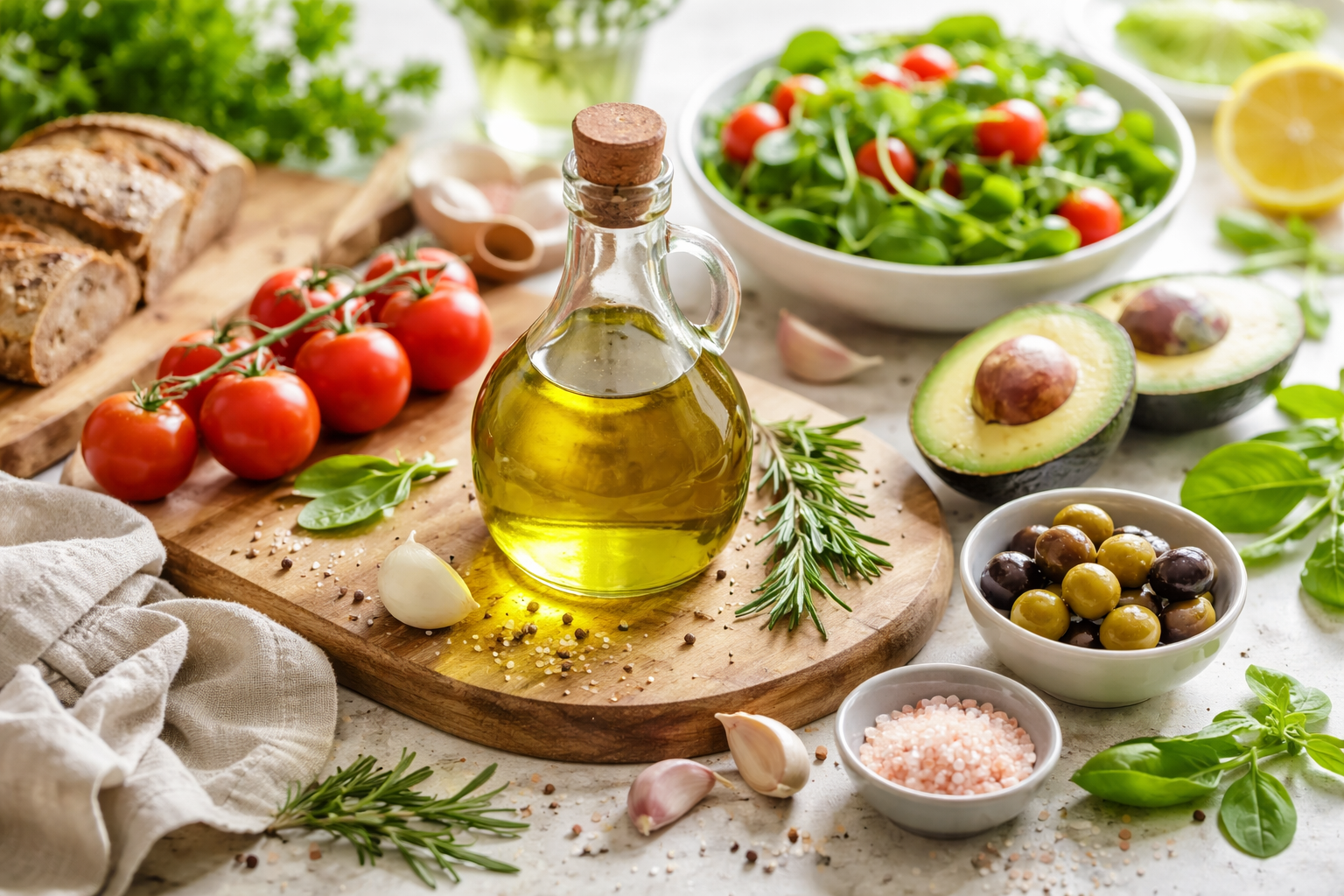 橄欖油特別是特級初榨橄欖油(Extra Virgin Olive Oil),是一種天然果油,不僅富含單元不飽和脂肪酸與多酚抗氧化物,還有助於抗發炎與提升免疫力。雖然比亞麻仁油穩定,但仍需妥善保存以防止氧化。