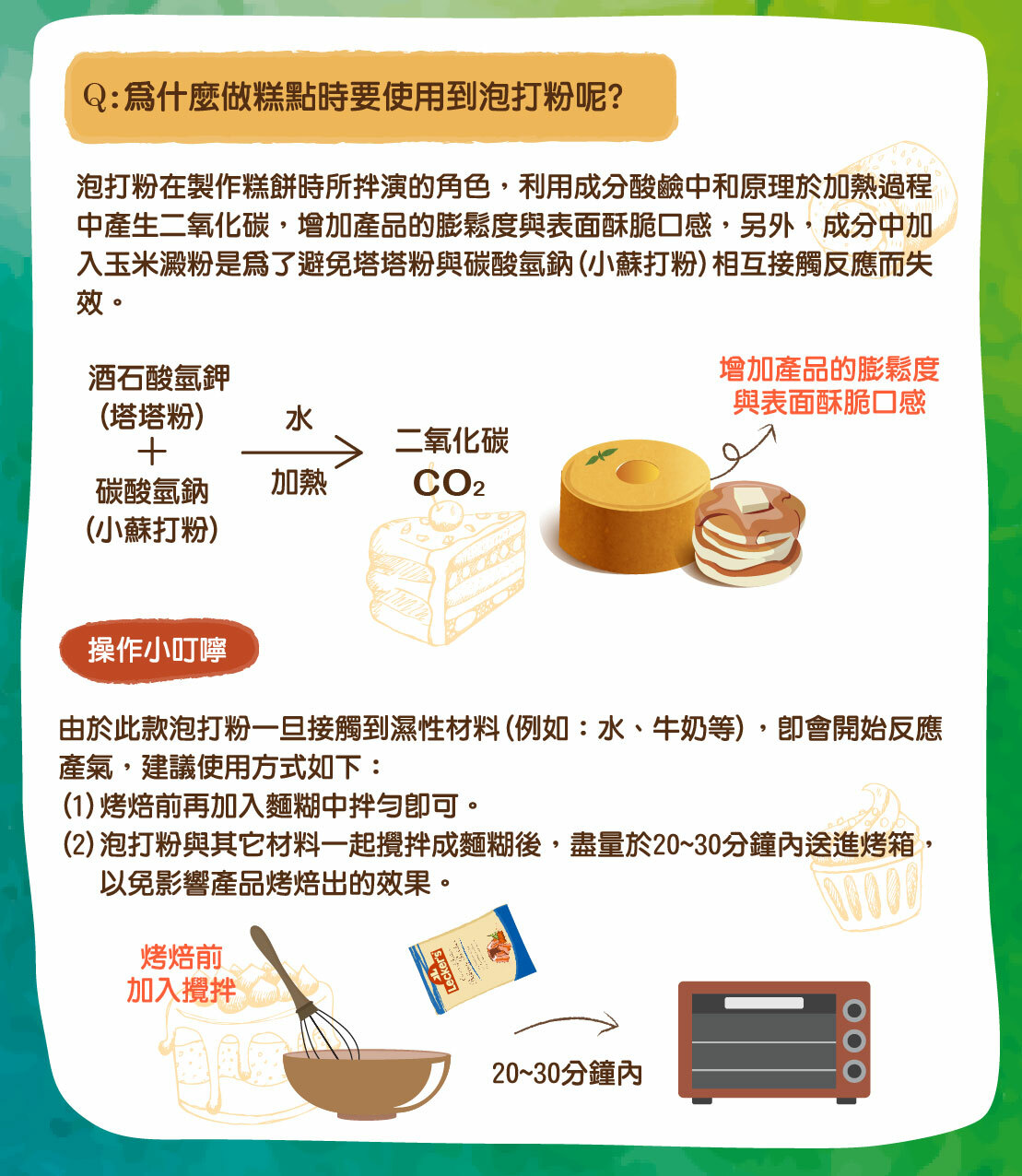 ˙ 適用於製作蛋糕、點心烘焙,可增加產品體積蓬鬆口感及酥脆度。