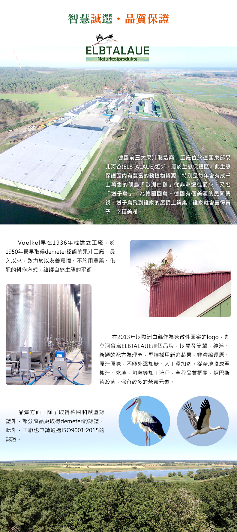 ˙ 來自德國前三大果汁製造商,工廠位於易北河谷(ELBTALAUE)近郊,屬於生態保護區,採以友善保護環境的耕作法。