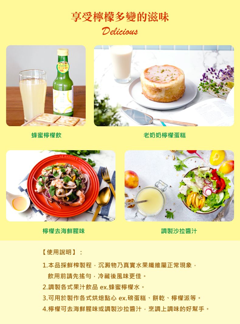 ˙ 每瓶以4顆檸檬壓榨成汁,主要選自南義大利和西班牙產的黃色西西里檸檬。